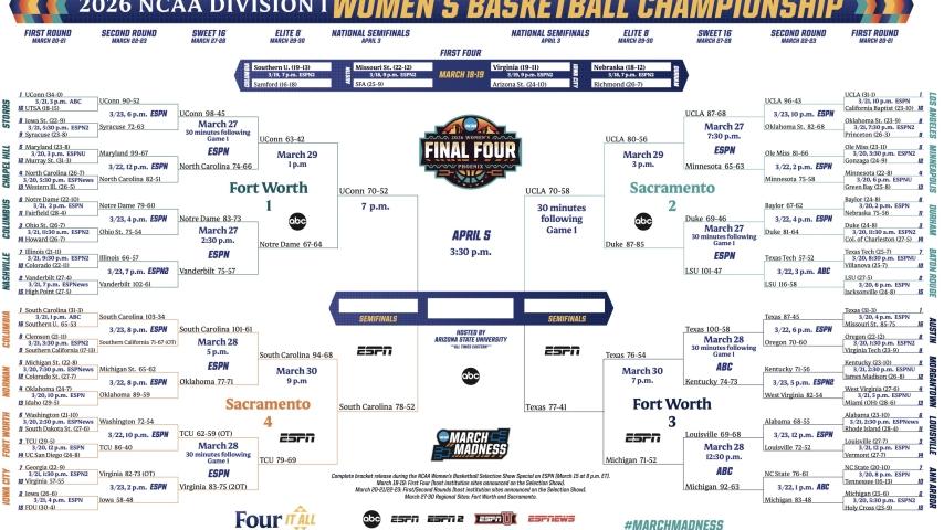 UConn, UCLA, Texas and South Carolina have claimed their spots in Phoenix for the 2026 women's Final Four.