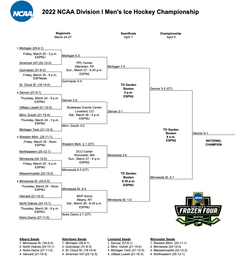 This is the printable bracket for the 2022 NCAA Division I men's college hockey tournament, which will crown a champion at the the Frozen Four in Boston. Denver took down Minnesota State, 5-1, in the title game to win the 2022 national championship.