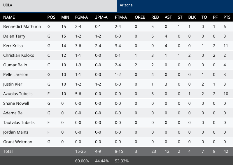 Another factor in this game has been bench points, as both teams had a few players get into some foul trouble they've had to go the bench. UCLA came up ended handed in that department with zero first half bench points and Arizona was able to get 10. ;