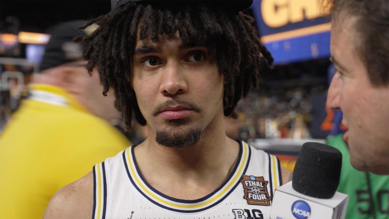 Andy Katz talks with Elliot Cadeau after Michigan's National Championship Win