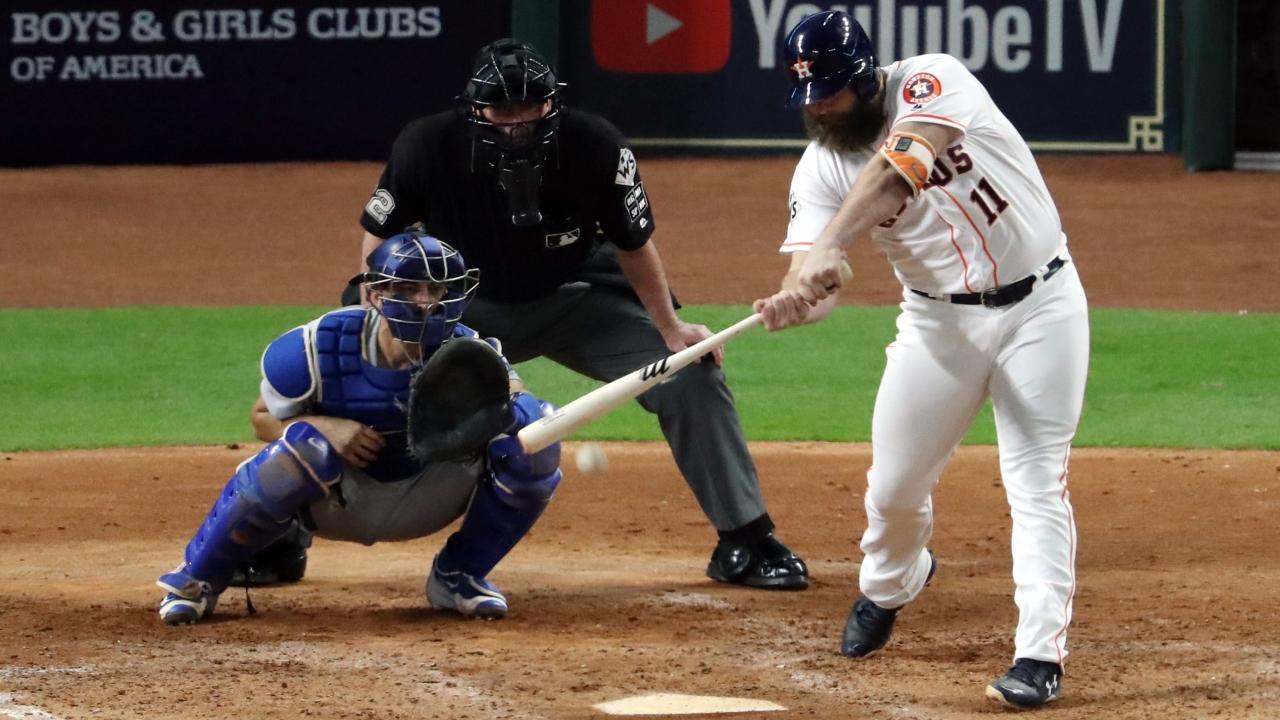Former UTPB standout Evan Gattis singles in Game 3 of the World Series.