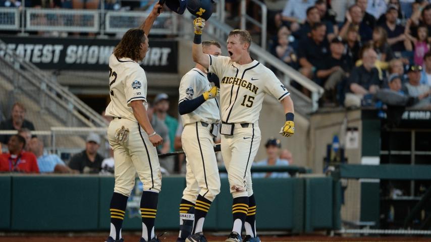 Jimmy Kerr, the honoree at first base, led all players in the 2019 CWS with eight RBIs. He became the first Michigan player to hit three homers in a College World Series.