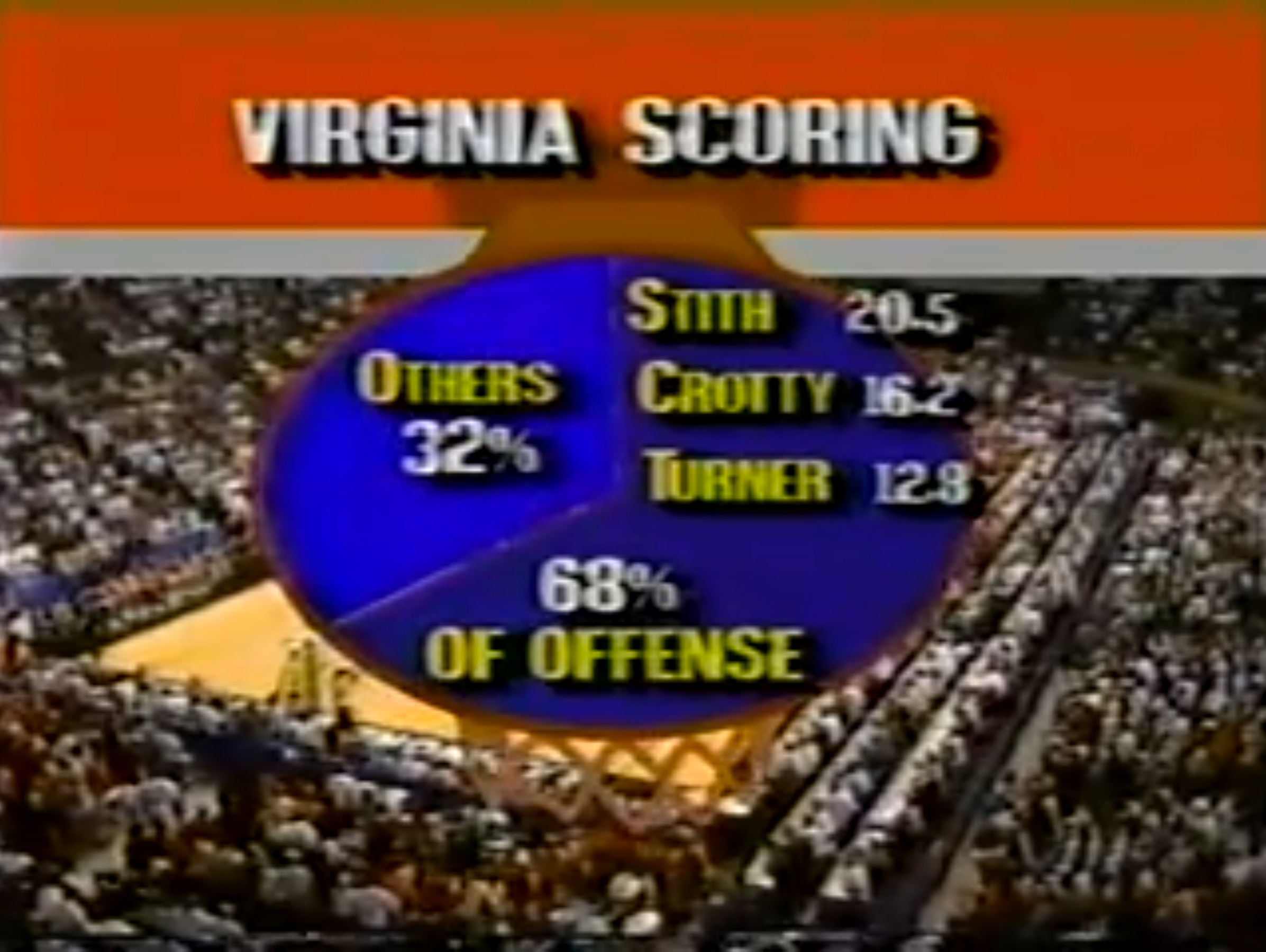 You'd also get graphics like the one below, which shows Virginia's scoring in a pie chart that's represented inside a cartoon basketball hoop. Graphics like this one would use a handful of bright colors with a strong contrast between them and all-caps, block lettering fonts with a shadow present behind them.