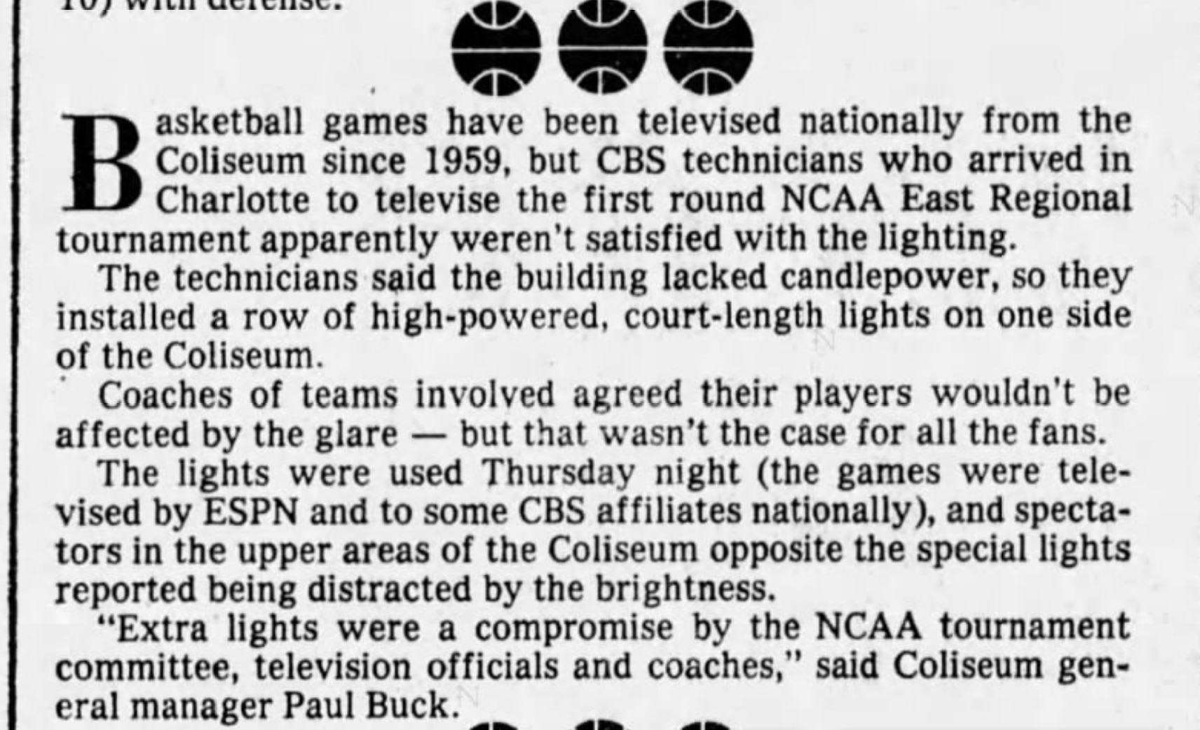 "The technicians said the building lacked candlepower, so they installed a row of high-powered, court-length lights on one side of the Coliseum," The Charlotte Observer reported in a notebook from the NCAA tournament. "Coaches of teams involved agreed their players wouldn't be affected by the glare — but that wasn't the case for all the fans.
