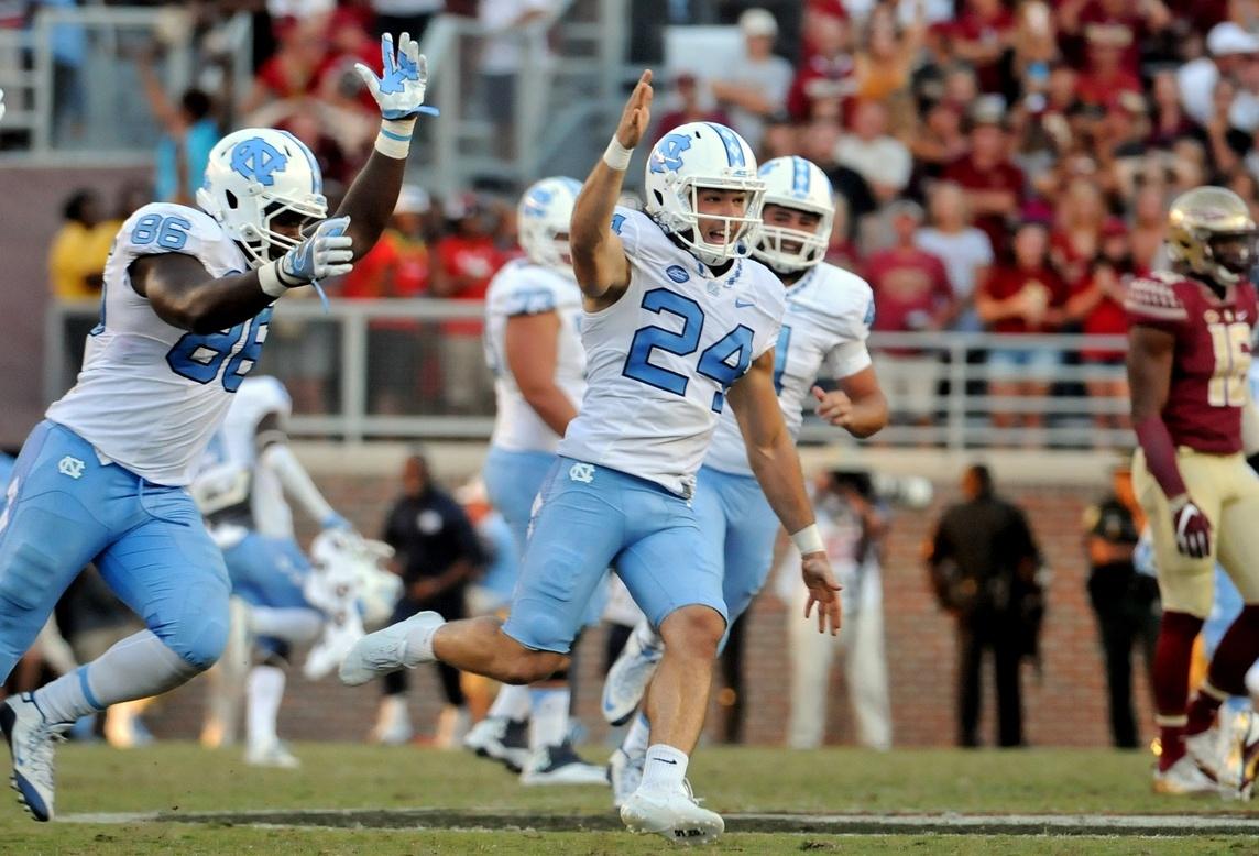 Nick Weiler's (24) 54-yard field goal gave UNC an upset over Florida State.