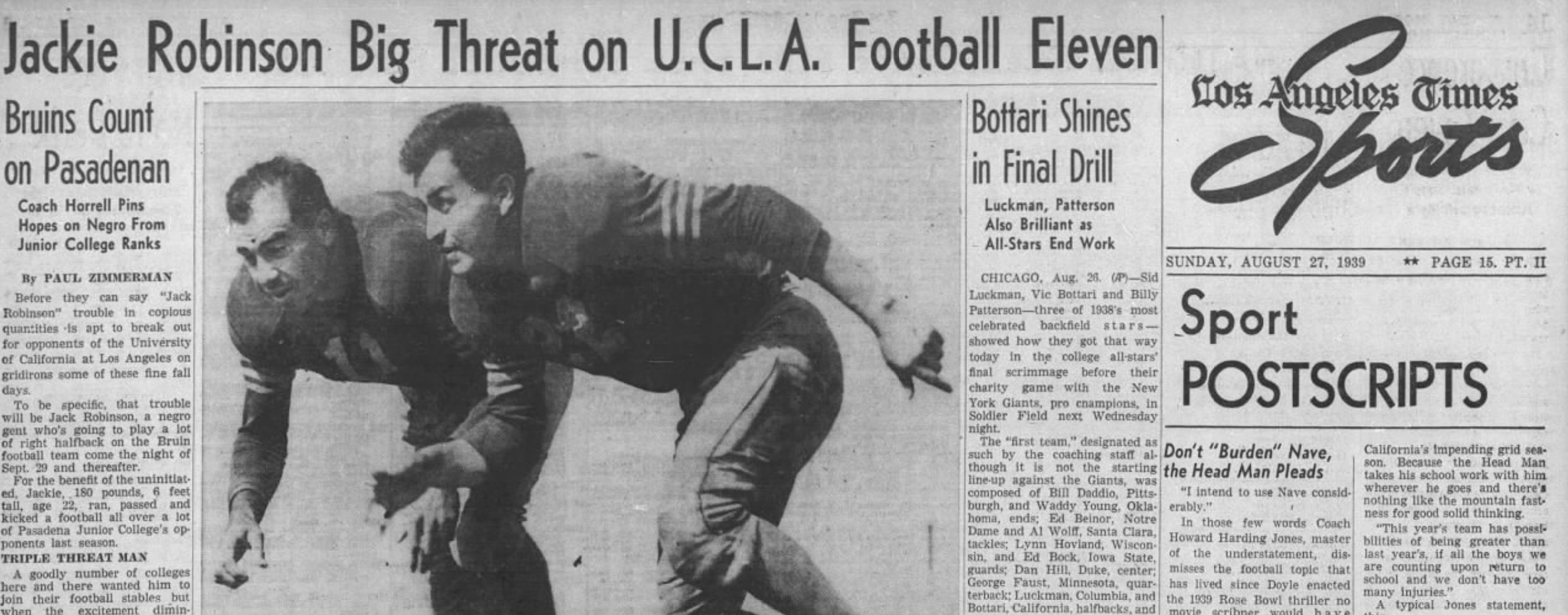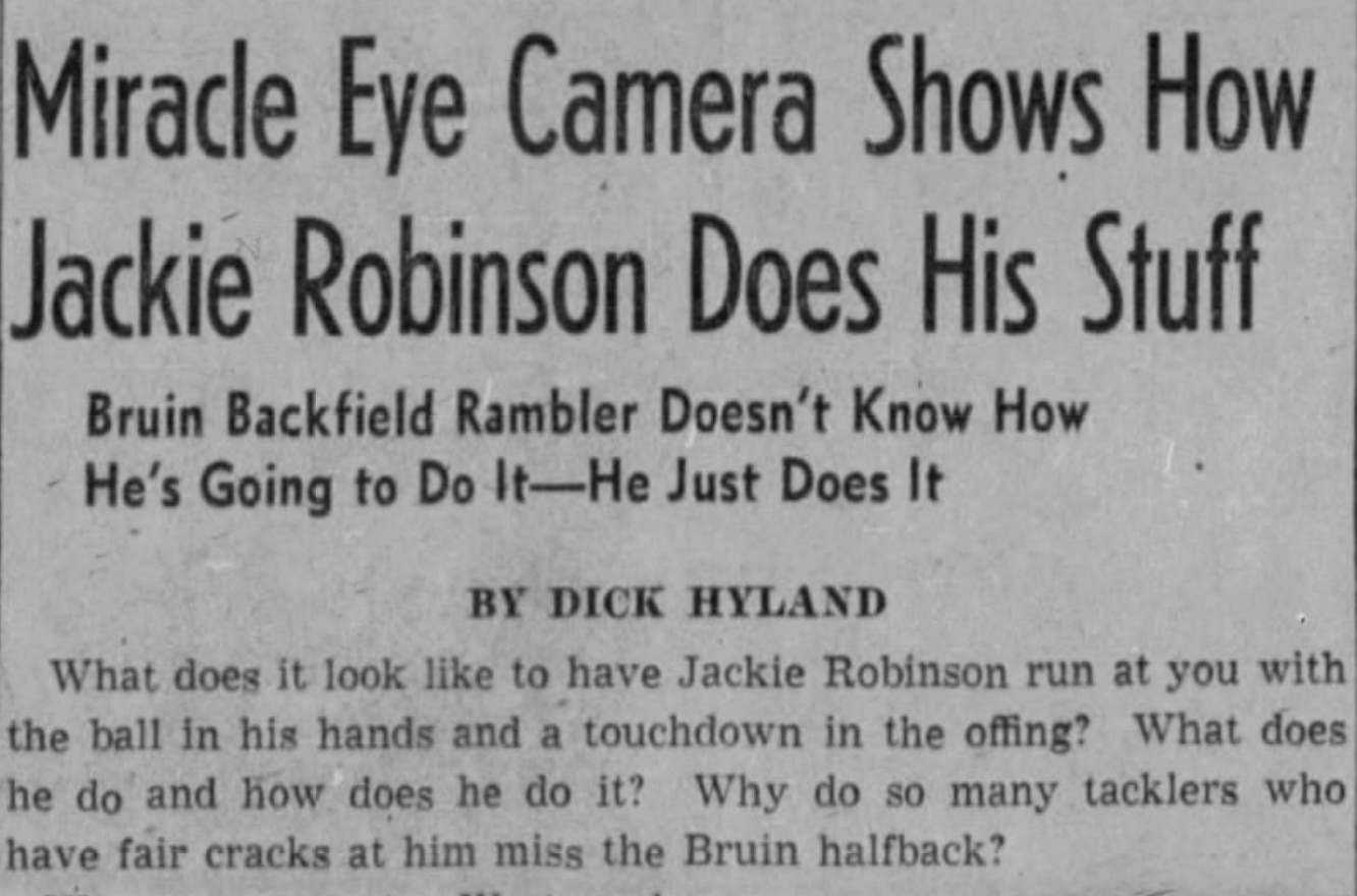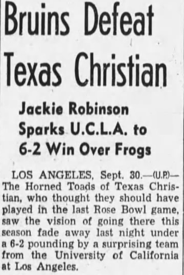 Robinson managed to live up to the hype in his debut with the Bruins, which defeated the TCU Horned Frogs 6-2, and Robinson got name-checked in the subheadline of the Oakland Tribune's game recap. "The game brought out a new U.C.L.A. star, Jackie Robinson...who slashed off long gains and lived up generally to his advance ballyhoo as about the fastest thing on cleats on the Pacific Coast," reported the United Press.