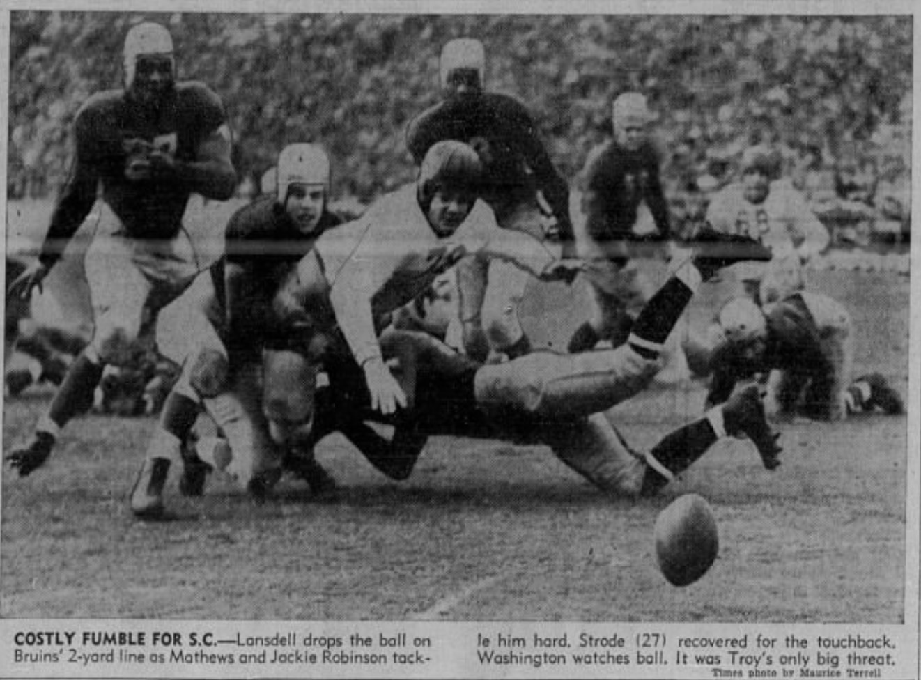 While Robinson later deflected credit on the play, telling reporters he couldn't hit hard enough to force a fumble, "finally the business of stopping the Trojan score was pinned on Robinson and Mathews," wrote the L.A. Times' Paul Lowry. "They accomplished such a smashing job of it that the ball shot out of Lansdell's grasp as if it was propelled from a cannon and the Trojans never got close again."