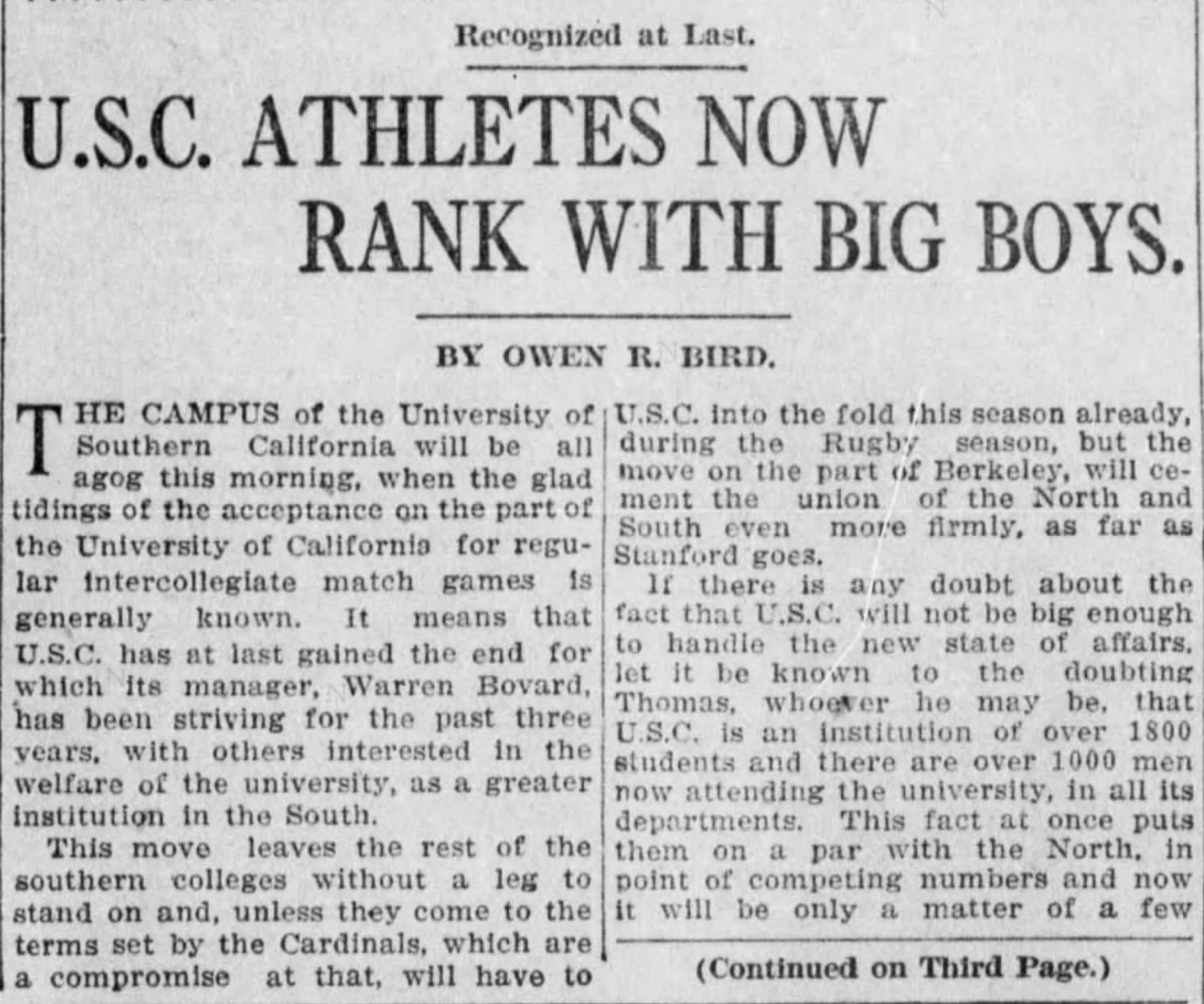 The story, which was written by Bird, detailed how Southern California had finally gotten the University of California to agree to regular athletic competition, to which Bovard "has been striving for the past three years."