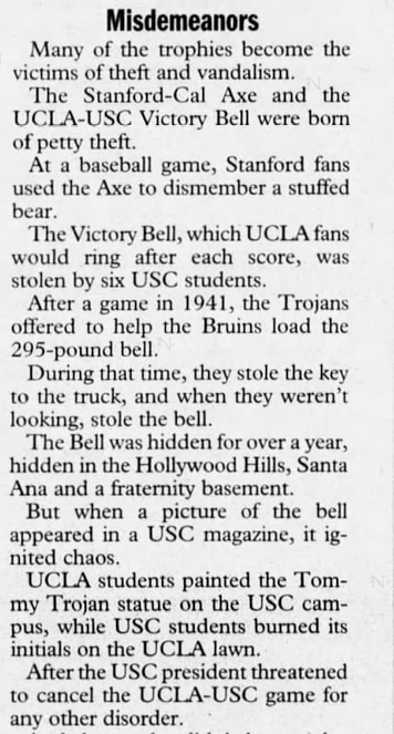 The following excerpt comes from a story published in The Desert Sun of Palm Springs, Calif, in October 1999, detailing some of the history of the UCLA-USC rivalry.