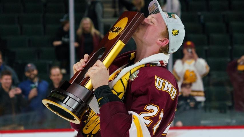 DI men's hockey | UMD wins tight battle in Frozen Four championship | April 7, 2018: Minnesota Duluth jumped out to a 2-0 lead and held off a late game surge from the Irish for a tense 2-1 victory. It marked the Bulldogs' second national title in program history.